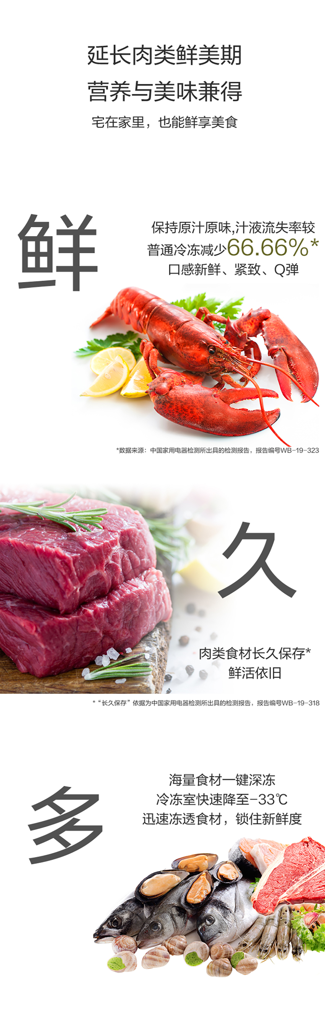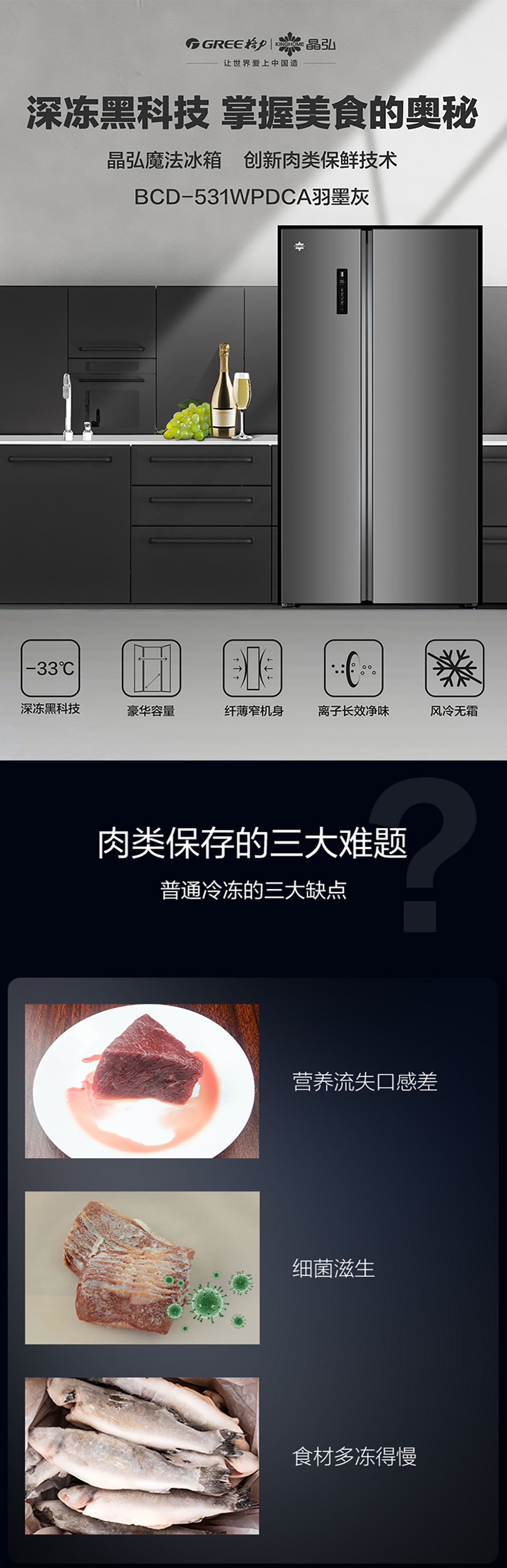 搭載-33℃深凍鎖鮮科技,肉汁飽滿更長久。采用離子長效抗菌凈味,抗菌率高達99.9%。風(fēng)冷無霜,拒絕風(fēng)干,食材水潤新鮮。